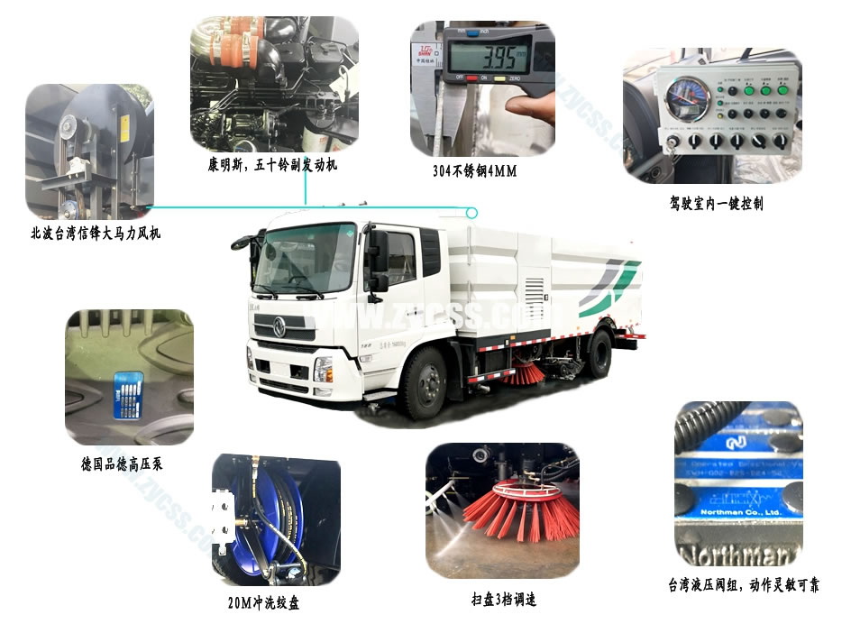軸距4700,康機(jī)ISB180 50,東風(fēng)6檔,9.00R20輪胎,空調(diào) 2、上裝配置: 帶掃盤4把,康明斯副發(fā)動機(jī);意大利馬達(dá);施耐德控件開關(guān);臺灣電磁閥組;免維護(hù)自分離式離合器;免維護(hù)風(fēng)機(jī);不銹鋼水箱;不銹鋼垃圾箱;尾部LED箭頭燈;手動泵應(yīng)急系統(tǒng);前掃刷臂轉(zhuǎn)動機(jī)構(gòu)使用高新耐磨工程隔套,免打黃油;精密冷彎無縫液壓油管。 可選配置:前沖、后灑、噴霧、自潔卷盤、作業(yè)監(jiān)控系統(tǒng)、輔助吸管裝置、推雪鏟等。
