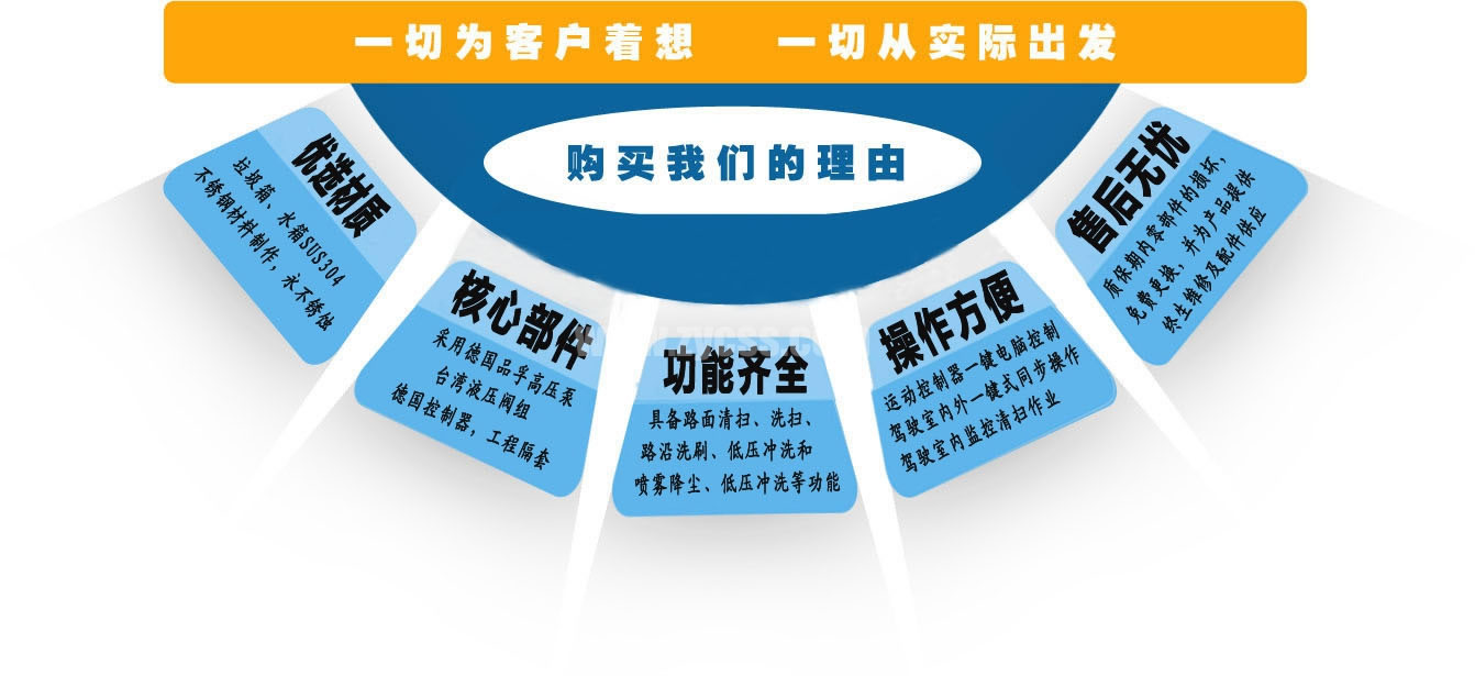 2、采用副發(fā)動機(jī)專門驅(qū)動風(fēng)機(jī)和液壓系統(tǒng),保證行駛過程中能繼續(xù)工作,保證清掃過程的連續(xù)性。 3、采用"中置四盤刷+后置吸嘴"的結(jié)構(gòu)布置,便于清掃裝置與吸嘴的調(diào)整和維護(hù),轉(zhuǎn)場時整車通過性好。 4、副發(fā)動機(jī)與風(fēng)機(jī)之間的傳動設(shè)置設(shè)有自動離合器,可保證副發(fā)動機(jī)空載起動和停機(jī)時與風(fēng)機(jī)的自動脫離,降低對副發(fā)動機(jī)的沖擊,提高了副發(fā)動機(jī)的工作可靠性和使用壽命。 5、掃盤有遇障避讓保護(hù)功能和復(fù)位功能,遇到障礙物后回縮,越過障礙物后復(fù)位。 6、根據(jù)不同清掃工況,在不增加副機(jī)油門的情況下,實(shí)現(xiàn)掃盤高中低三檔調(diào)速,即能保證在各種污染狀況下都有良好的清掃效果,同時節(jié)省油耗以及刷毛的損耗。 7、采用可隨路面自動找平的全浮動式吸嘴,吸塵效果好,使用壽命長。 8、進(jìn)口液壓閥組,能保證整車的液壓動作的穩(wěn)定性和流暢性。 9、進(jìn)口液壓馬達(dá),能保證掃盤的工作穩(wěn)定性,使用壽命長。 10、進(jìn)口原料制成的外翻式吸塵管,有效防止吸塵管被劃破、凍裂,增加使用壽命。 11、精密無縫冷彎液壓油管,內(nèi)壁無氧化雜質(zhì),保證液壓油路清潔,不堵閥。 12、掃盤刷臂內(nèi)使用高性能工程塑料隔套,耐磨性好,免打黃油免維護(hù),節(jié)省人力物力。 13、不銹鋼水箱、垃圾箱,可抗一般性腐蝕,增加箱體的使用壽命。 14、超寬后門且大于90度的開啟角度,更易于傾倒垃圾,清理垃圾箱。 15、垃圾箱傾翻角度大于48度,易于傾倒垃圾。 16、可加裝前沖、后灑、噴霧、自潔卷盤、作業(yè)監(jiān)控系統(tǒng)、輔助吸管裝置、推雪鏟等。 ![]() 產(chǎn)品功能特點(diǎn)